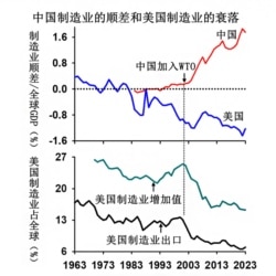 而全球的顺差是由美国提供的,因为美元是国际储备货币。中国是世界第一大顺差国,而美国是第一大逆差国,互为镜像。中国的顺差增加,导致美国逆差增加和制造业衰落。随着中国GDP占全球比重从2001年4%上升到2023年17%,制造业顺差占全球GDP比重从0.1%上升到1.8%,国际社会(尤其美国)越来越难以承受了。